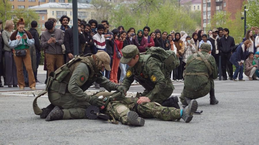 На территории Тихоокеанского Медицинского прошли праздничные мероприятия, посвященные Дню Победы. Интересной и захватывающей частью программы стал мастер-класс по тактической медицине, подготовленный ребятами из военно-патриотического клуба «Подвиг Поколений».