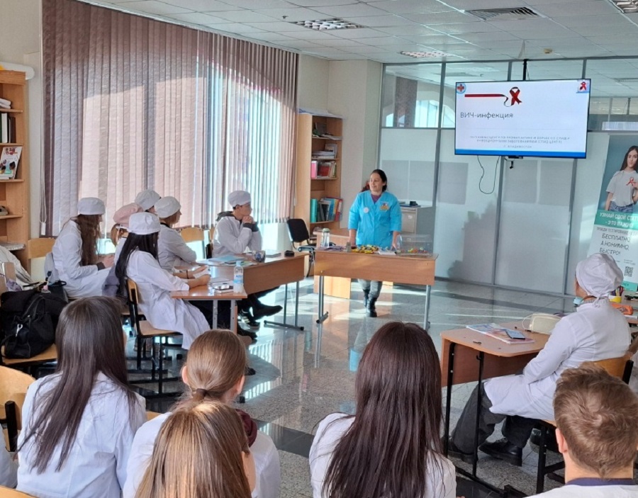 Состоялись мастер-класс и анонимное тестирование на ВИЧ-статус студентов 1 и 2 курса факультета среднего профессионального образования специальностей «Сестринское дело» и «Стоматология профилактическая». Специалист государственного учреждения здравоохранения «Краевой клинический центр по профилактике и борьбе со СПИД и инфекционными заболеваниями» Петращук Ольга Валерьевна провела беседу с будущими медиками, в ходе которой участники пришли к общему мнению, что каждому человеку необходимо точно знать свой ВИЧ-статус, чтобы, в случае выявления вируса в организме, вовремя начать лечение.