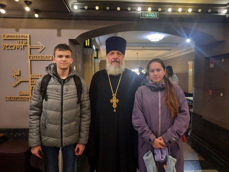 Обучающихся пригласил на показ и встретил перед началом Александр Борисович Талько, настоятель храма великомученика и целителя Пантелеимона, руководитель социального отдела Владивостокской епархии, врач-психиатр ГБУЗ «Краевая детская психиатрическая больница».