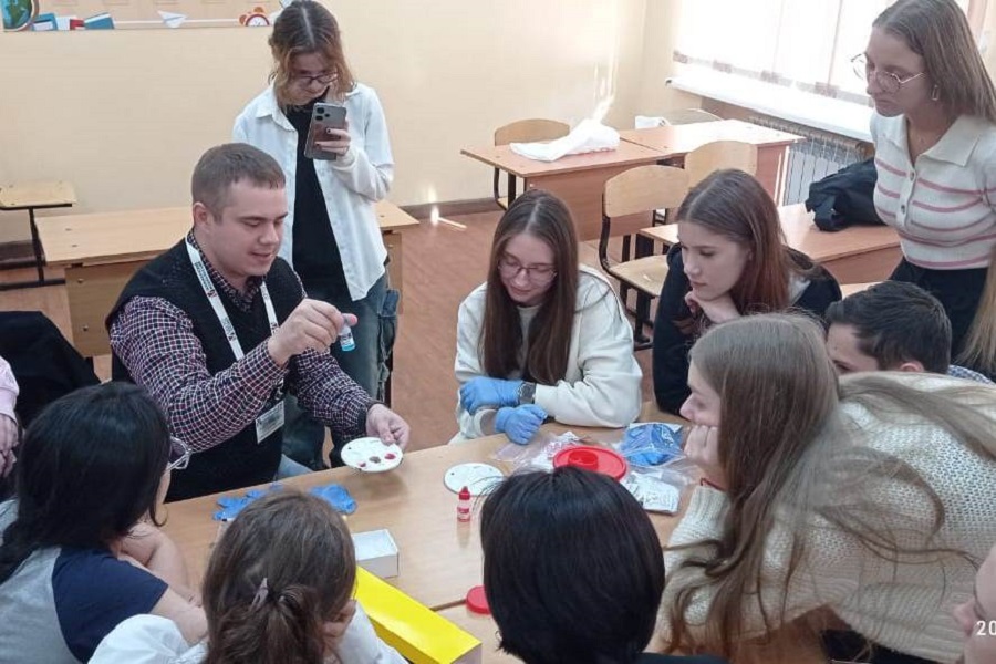 Максим Сергеевич рассказал старшеклассникам о группах крови, их классификации и об основных представителях эритроцитарных популяций.
