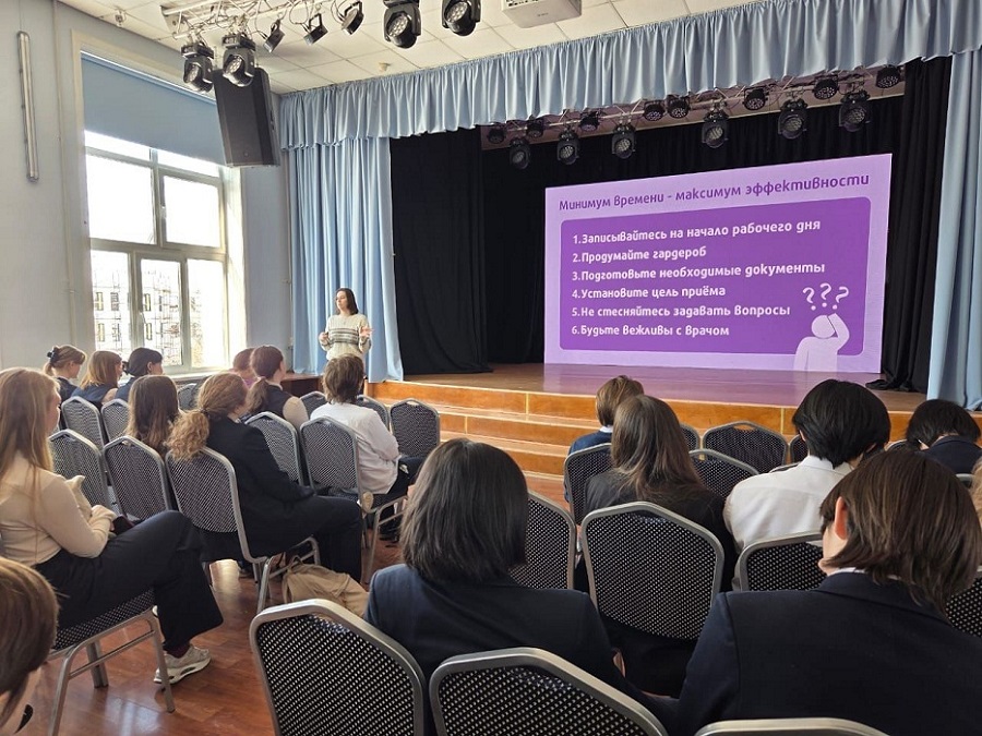Учащиеся старших классов МАОУ «Лицей № 1», МАОУ «Гимназия № 2» и МАОУ «СОШ № 3 имени Героя России Сергея Ромашина» задавали вопросы о том, что нужно сделать, чтобы поступить в медицинский университет, как обучаются студенты-медики, и что такое профессиональное развитие в сфере медицины, ординатору 1 года обучения специальности «Онкология» Тихоокеанского Медицинского Юлии Ивановне Никитиной: